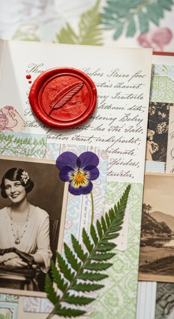 A wax seal corner gives a scrapbook page a vintage, storybook feel. Use sealing wax or even hot glue colored with marker to create a raised seal. Press a small button or coin into it while warm to create texture. Place the seal in one corner of the page near a photo or note. Keep the rest of the layout simple so the detail stands out. Budget tip: If real wax feels tricky, cut a small circle from red paper and add a drawn swirl design to mimic a seal. This little touch adds charm and makes the page feel thoughtfully decorated without a lot of effort.