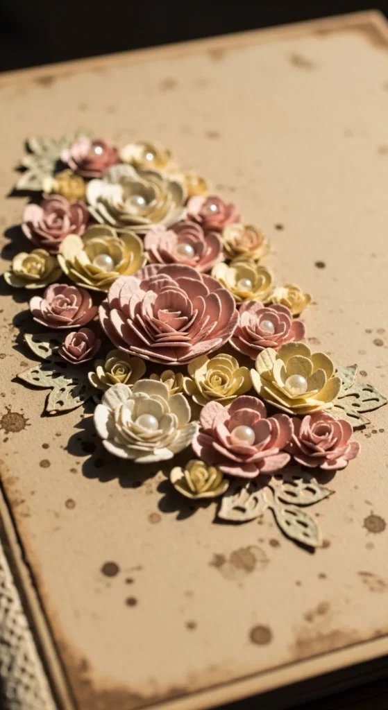 3D paper flowers add gentle depth to a scrapbook cover or special page. Cut flower shapes from colored paper and stack two or three layers together. Slightly curl the petals upward with your fingers. Glue a small bead or dot of paint in the center. Arrange a few flowers in one corner rather than covering the whole page. Budget tip: Use pages from old magazines or gift wrap for colorful petals. Keeping the flowers small prevents bulk while still giving the page a soft, decorative look.