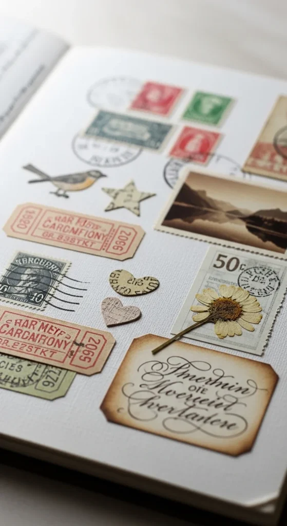Ephemera pieces help fill empty spots and tie a layout together. Use small paper bits like ticket shapes, stamps, tiny labels, or patterned scraps. Tuck them under photo corners or along page edges. Stick to one color family so the page feels calm instead of messy. Budget tip: Cut shapes from junk mail or packaging designs. Even simple lined notebook paper can look cute when trimmed into small tags. These little details make the page feel layered and thoughtful without extra cost.