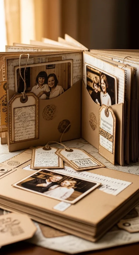 A paper bag scrapbook turns simple lunch bags into charming memory pages. Stack several paper bags together, fold them in half, and staple or stitch along the fold. The open ends become pockets where you can slide in photos, notes, or tickets. Decorate the outside of each bag page with patterned paper, doodles, or fabric scraps. Add tags with handwritten dates or short memories. Budget tip: Use grocery bags or recycled kraft paper to keep costs low. This style feels cozy and handmade, and the pockets make it interactive. It’s perfect for travel memories or school moments where you have lots of small keepsakes.