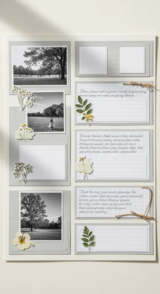 A layout template page keeps things neat when you feel stuck. Divide the page into clear sections: one spot for a large photo, two for small ones, and one area for notes. Lightly draw pencil lines as a guide, then decorate inside those spaces. Budget tip: Reuse the same layout on several pages with different colors or themes. This saves time and reduces decision stress while still looking polished.