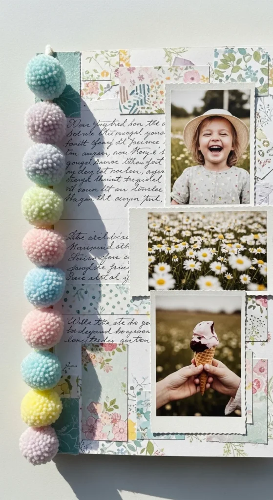 A pom-pom ribbon edge adds soft texture and a cozy feel. Glue a short strip of pom-pom trim along the outer edge of the page or cover. Keep it to one side so the book still closes easily. Choose colors that match your photos for a gentle look. Budget tip: If you don’t have ribbon, glue small yarn loops along the edge for a similar effect. This detail makes the scrapbook feel handmade and extra sweet.