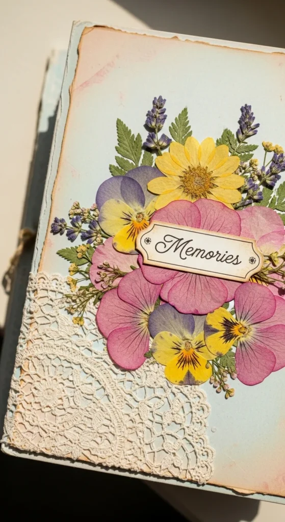 A pressed flower cover gives your scrapbook a soft, romantic feel. Glue dried flowers or leaves onto the cover and frame them with a paper border. Add a lace doily or soft fabric behind the flowers for texture. Budget tip: Press flowers from your garden inside a heavy book for a week. Seal them with clear glue to keep them secure. This cover sets a gentle tone before anyone even opens the album.