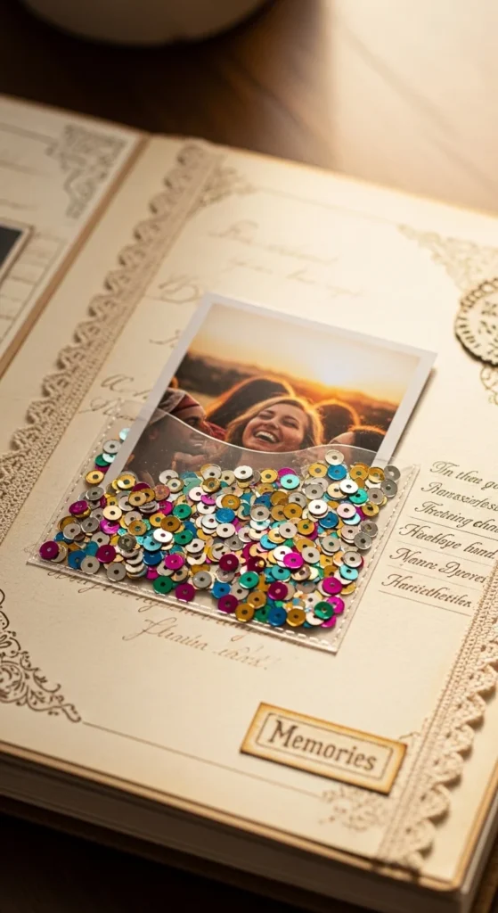 A sequin shaker pocket adds playful movement. Place a photo inside a small clear plastic sleeve. Add a few sequins before sealing the edges with tape or glue. When you shake the page, the sequins move around the photo. Budget tip: Use recycled plastic packaging as the clear window. This detail adds fun texture without much effort.