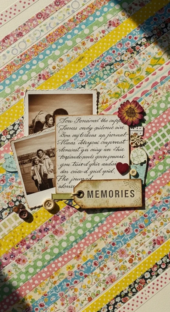 A washi tape background is one of the quickest ways to make a page look bright and cheerful. Tear or cut strips of washi tape and place them side by side or in crossing angles. Let some strips overlap slightly for a relaxed feel. Leave a clear space in the center for photos so the background doesn’t feel too busy. Budget tip: If you don’t have washi tape, use masking tape and color it with markers or watercolor. This method adds color and pattern without needing extra paper layers. It works well for fun, everyday memories like hangouts, selfies, or family dinners.