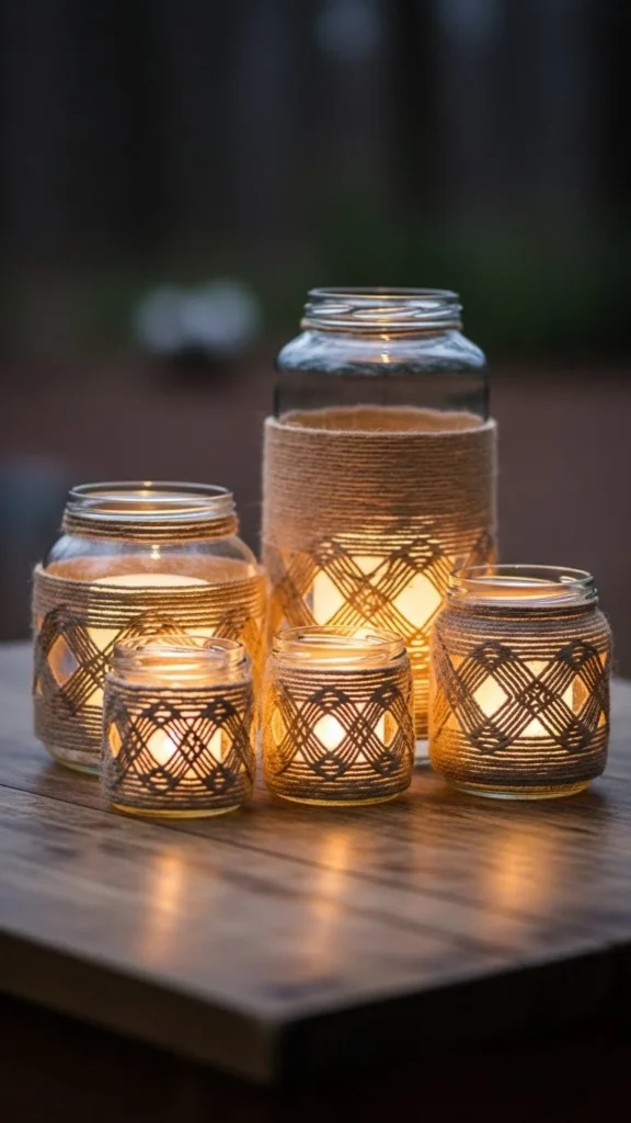Wrap jars in twine for rustic charm. Budget-friendly DIY using leftover craft twine. Lightweight and reusable. Adds warmth and texture. Perfect for cozy indoor décor.