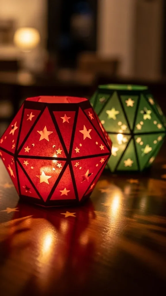 Fold colorful paper into lantern shapes. Budget-friendly DIY. Lightweight and safe. Kids enjoy crafting. Hang or place on tables for festive glow. Adds intricate, handmade detail.