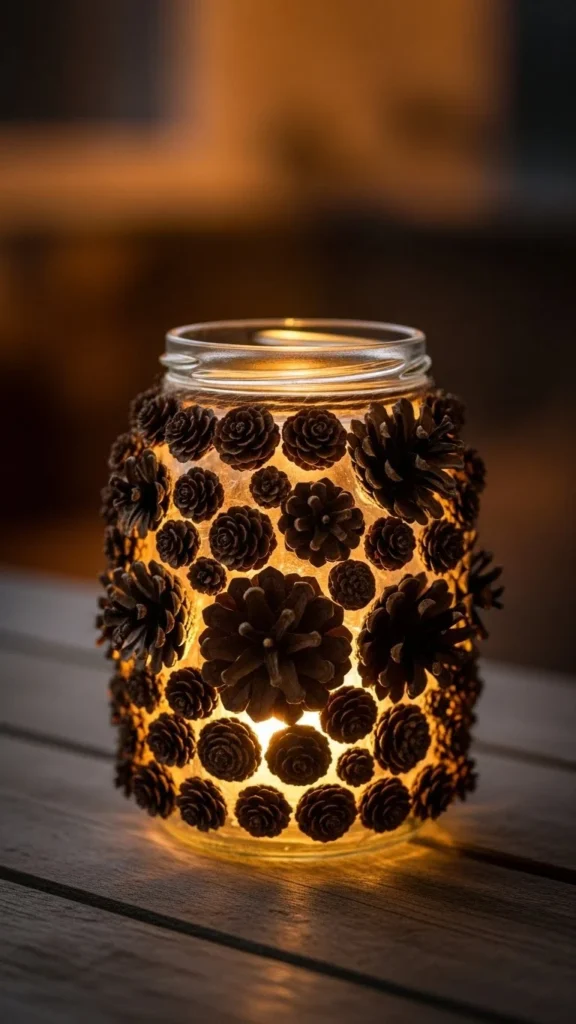 Glue small pinecones to jars or containers. Budget-friendly DIY. Lightweight and reusable. Guests enjoy rustic, natural décor. Add a candle or LED light inside. Perfect for bringing outdoorsy charm indoors.