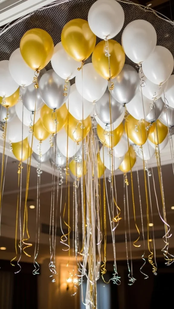 Metallic balloons instantly add glamour. Use a simple mesh or net to hold balloons. Suspend above the main party area. Release at midnight for maximum impact. Use lightweight balloons for easy setup. Add small confetti pieces for extra sparkle. Budget-friendly metallic balloons are widely available. This DIY is simple and dramatic without heavy equipment.