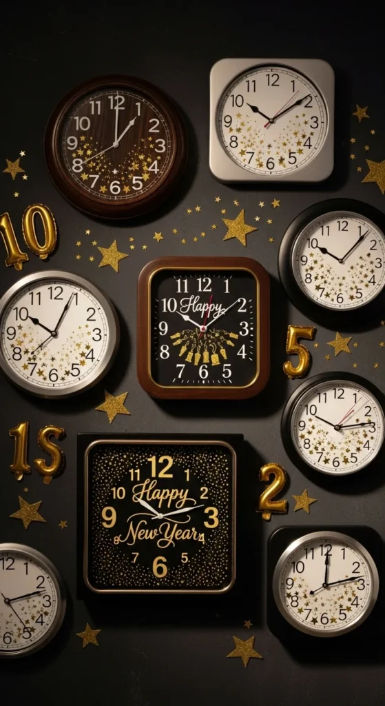 Make the countdown visual with a wall of clocks. Paint thrifted clocks in gold and silver, each showing different time zones. Add stickers or confetti around them. It’s a creative way to celebrate a global new year and adds movement to your wall.