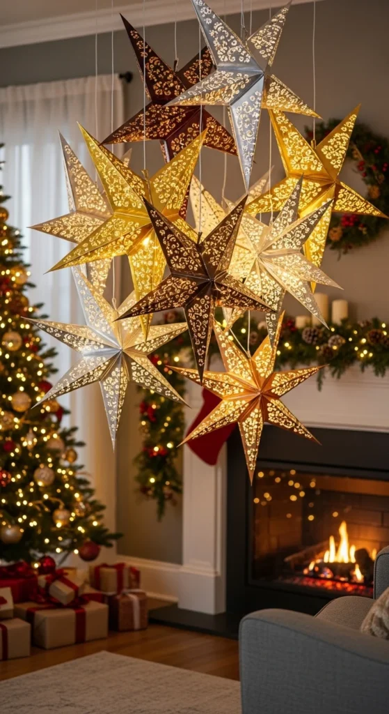 Paper star lanterns are budget-friendly and beautiful. You can make them using thick paper or buy flat packs to assemble. Hang them above your dining table or window. Place LED lights inside for a soft glow. Mix large and small sizes for dimension.