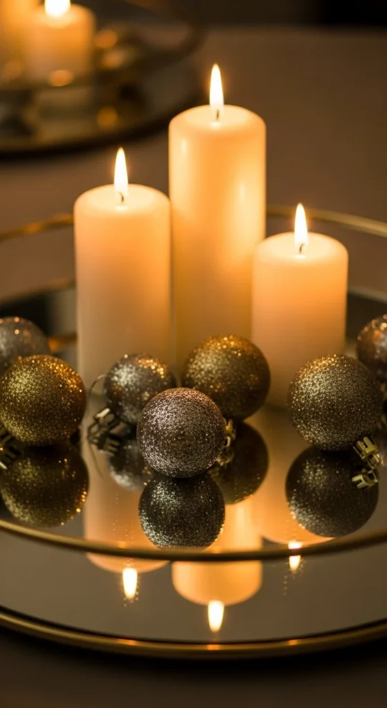 Arrange candles on a mirrored tray for simple elegance. Add small ornaments or metallic beads around them. The reflection doubles the glow and feels warm and festive. Use battery candles if you have kids or pets.