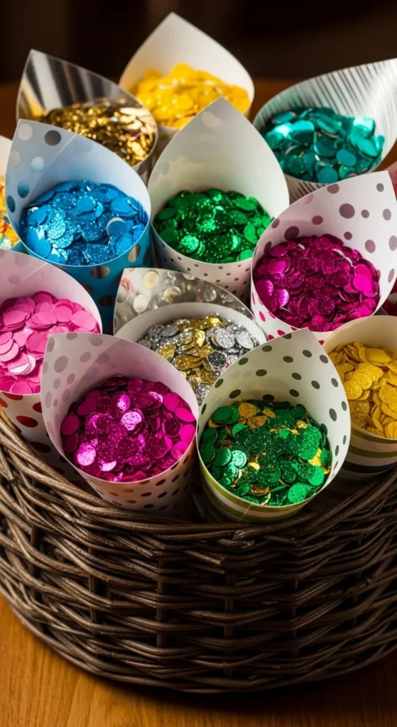 Roll paper into cones and fill them with homemade confetti. Use metallic paper or recycled magazine pages. Hand them to guests for the midnight countdown. Cleanup is easy if you use biodegradable paper.