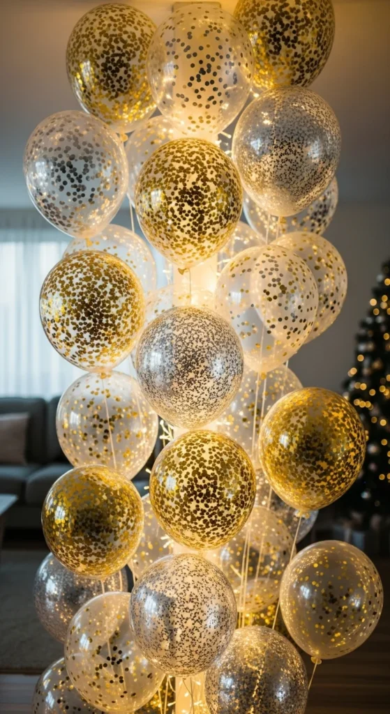 Fill the ceiling with helium balloons and tie curling ribbons to each. Add handwritten wishes or resolutions to the strings. At midnight, gently tug them down for a fun moment. It’s cheap, cheerful, and perfect for selfies.
