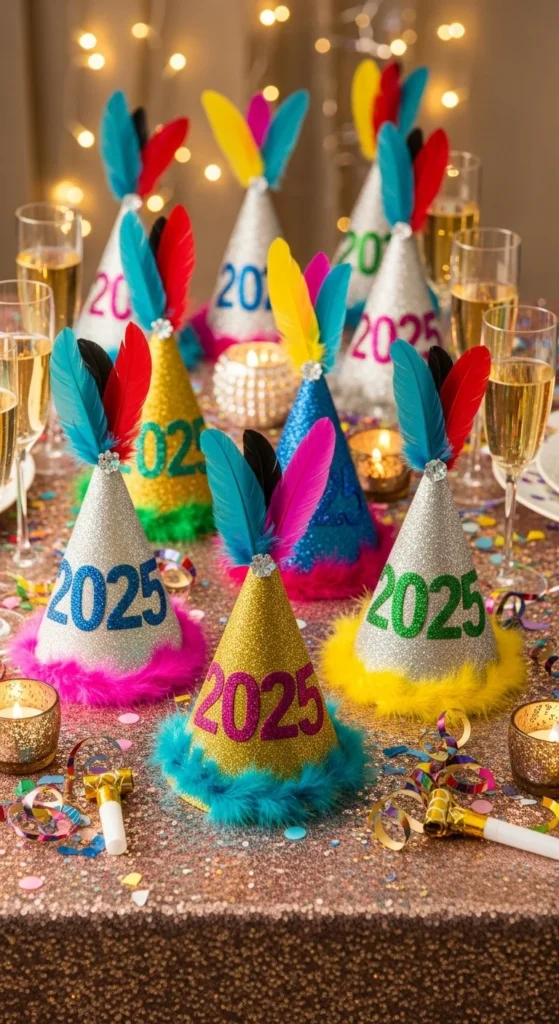 Cut cardstock into cones and decorate with sequins, feathers, or metallic tape. Add an elastic string for comfort. You can even personalize each hat with names. Display them in a basket for guests to grab before midnight.