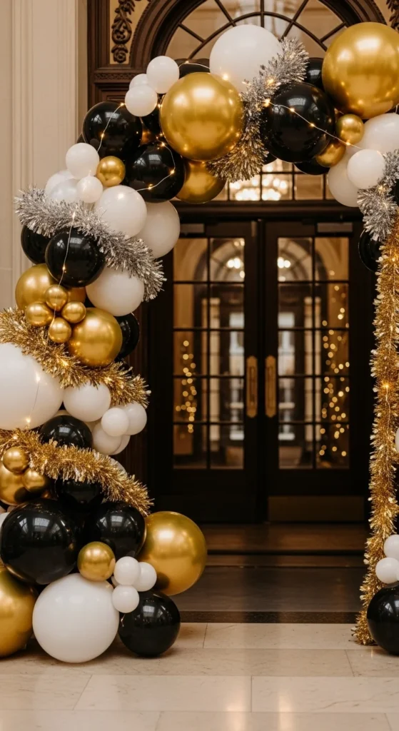 Create a grand entrance with a balloon arch. Mix different sizes and shades for depth. Use a frame or tape balloons directly to the wall. Add tinsel and mini lights for extra flair. It’s affordable yet stunning for photos and greetings.