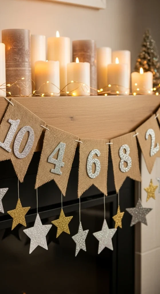 Create a countdown display that builds excitement. Cut numbers from gold cardstock and string them across twine. You can add mini clothespins or tassels between each number. Hang it above the snack table or entryway. Kids can help decorate the numbers with sequins or markers. When midnight hits, flip them to reveal “Happy New Year.” It’s simple, personal, and adds movement to your space.