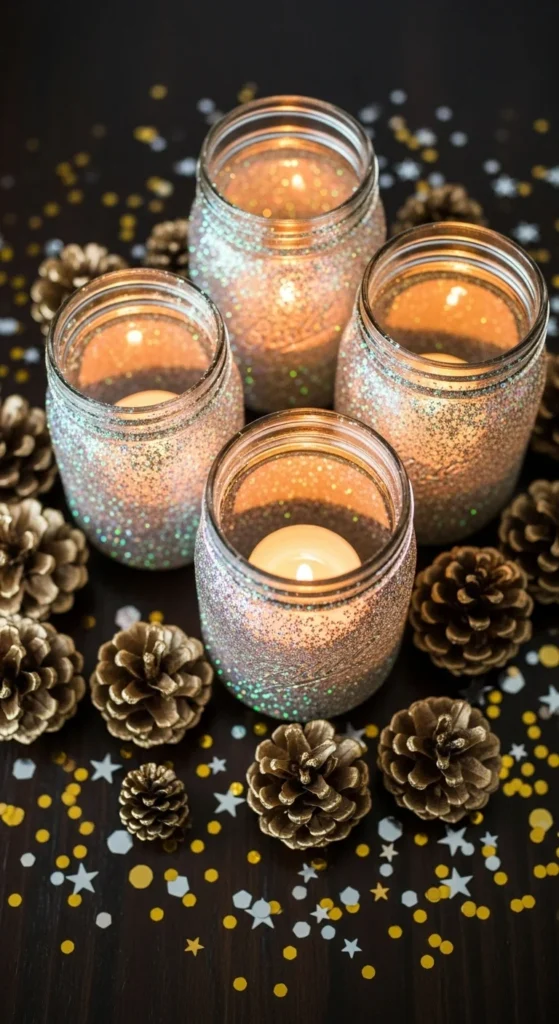 A table centerpiece can set the whole mood. Fill clear jars with glittery water, floating candles, or metallic beads. Add faux snow or tiny ornaments for a frosty vibe. Surround them with pinecones sprayed gold or silver. Use a mirrored tray underneath for extra shine. These can be built using dollar-store finds and reused for future holidays.