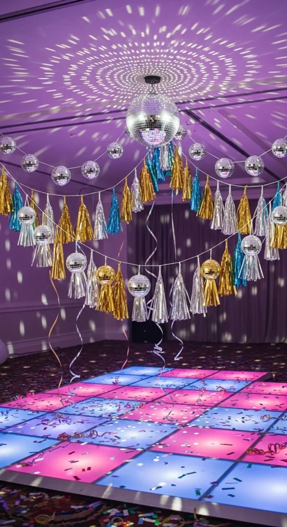 Turn your space into a mini dance floor. String small disco balls on a clear fishing line and mix them with tinsel tassels. Hang them above your snack table or across the ceiling. The reflections catch every bit of light, creating instant party vibes. You can find mini disco balls online for cheap, or glue mirrored tiles on old ornaments.