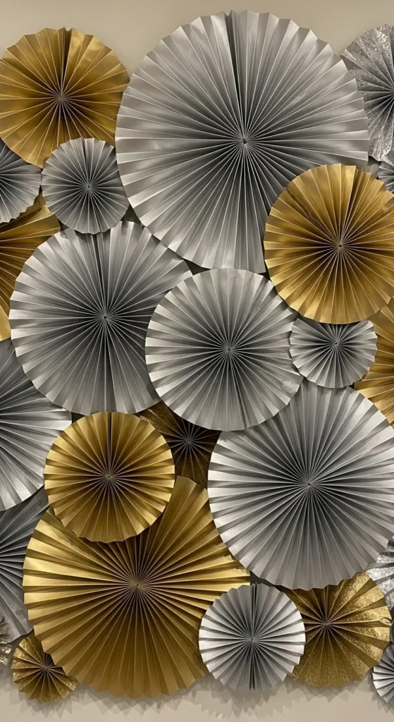 Mix different sizes of paper fans and glue them to cover a wall section. Overlap for texture and dimension. It creates a full, professional look for minimal cost.
