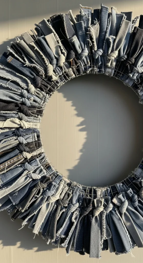 Cut old jeans into strips and tie them around a wire circle. Add bows or buttons for personality.