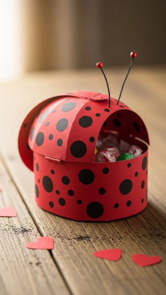 Paint the box red, add black dots, and create cute antennae. This simple project works well for younger kids and still looks adorable on classroom tables.