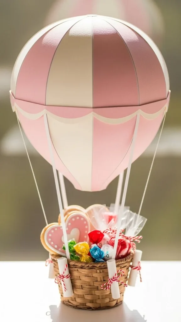 Attach a large paper balloon to a box “basket.” Add small heart patterns for decoration. This creates a tall, whimsical design that captures attention instantly.
