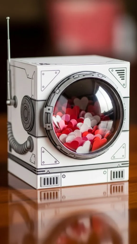 Use a circular cutout as the “visor.” Cover the box in metallic or white paper and add small patches or stars. Kids fascinated by space themes love this design because it feels playful and imaginative.