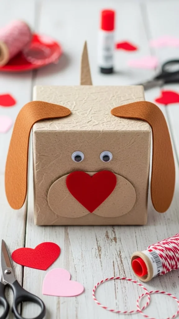 Turn a simple box into a cute puppy with paper ears, eyes, and snout. Paint or color the box in brown, white, or black. Add a heart-shaped nose for Valentine flair. This design works well for dog-loving kids and requires just basic craft supplies.
