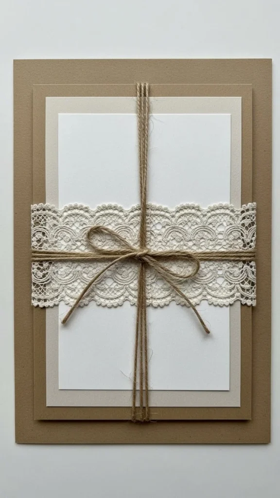 Glue lace strips onto kraft paper. Tie twine around the fold. Add a button if you like. It feels vintage using leftover trims and craft drawer extras.