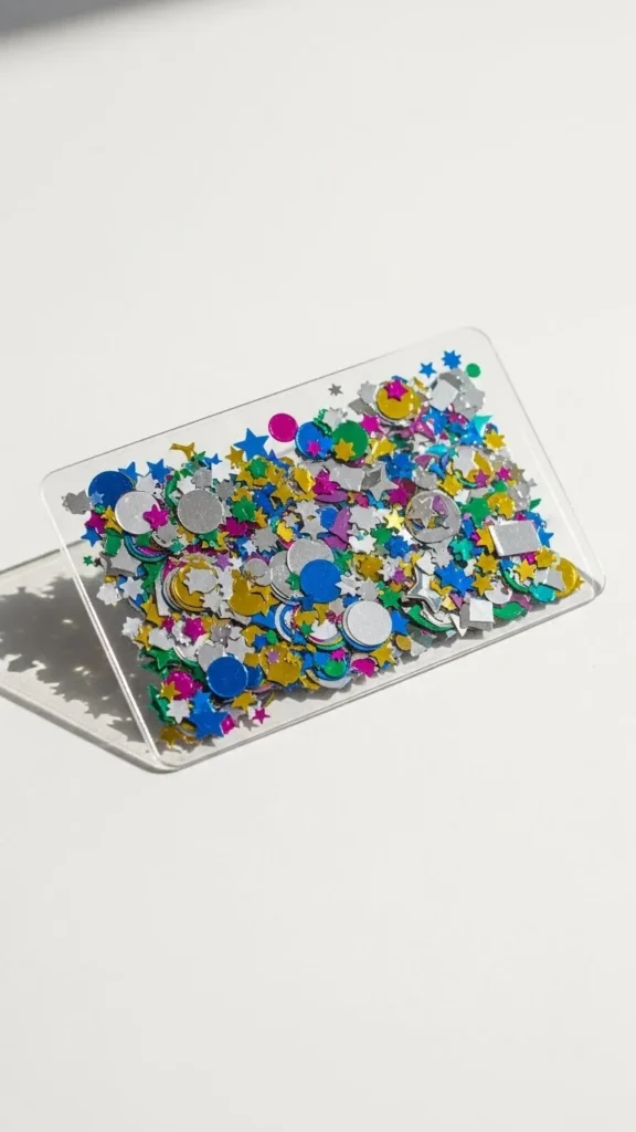 Use plastic packaging as a window. Fill with paper dots or glitter. Seal edges. Shake to smile.
