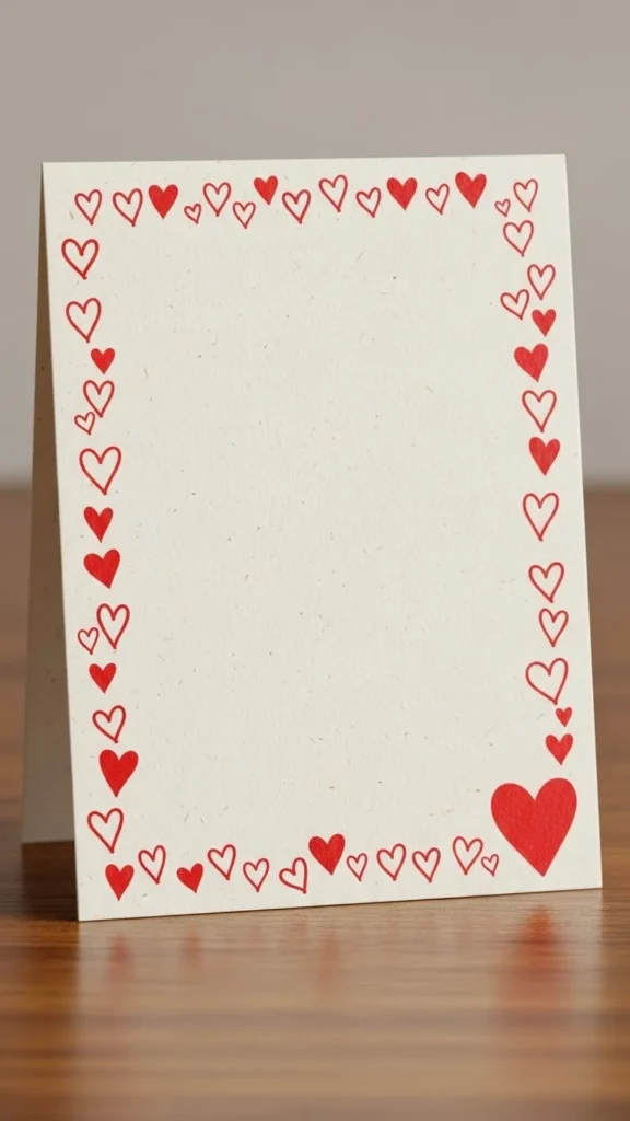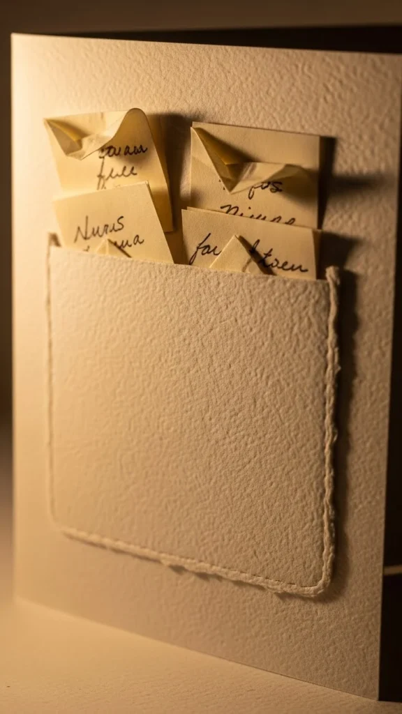Make a small pocket using paper. Glue to card front or inside. Fill with tiny notes—one word per paper. Use jokes, promises, or sweet phrases. This card becomes interactive. Recycled paper works perfectly. Low effort. High emotion.