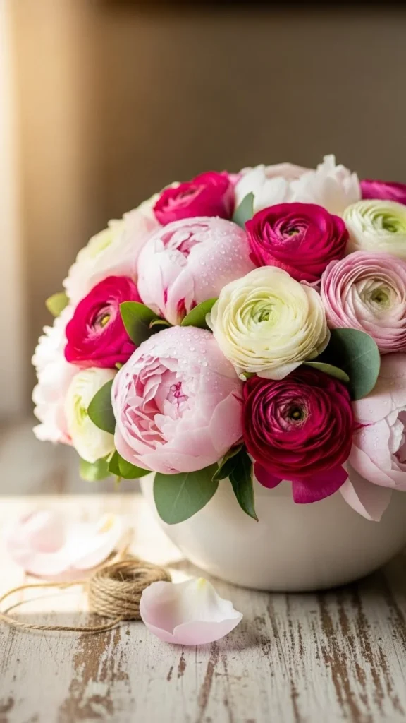 Short stems packed tightly into a bowl create soft fullness. Mix peonies, ranunculus, and a few wax flowers for detail. Place this on a vanity or coffee table for a soft, romantic accent.