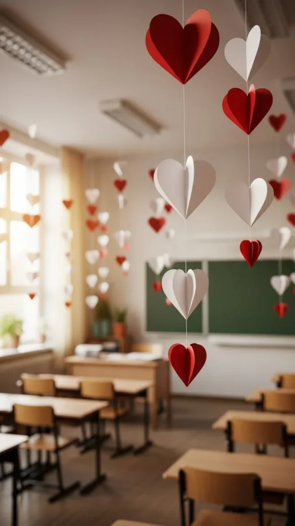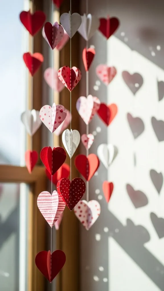 Heart garlands bring instant Valentine charm. Cut simple hearts and string them with thread or twine. Spacing does not have to be perfect. That handmade look adds warmth.