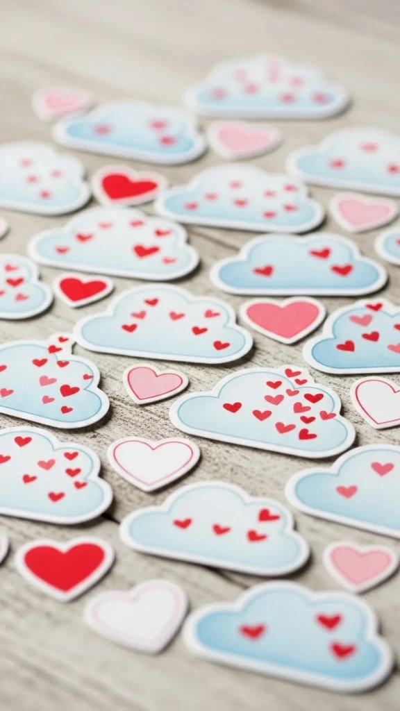 Clouds with hearts feel gentle. Use pale blue and pink. Nice for journals and notes.