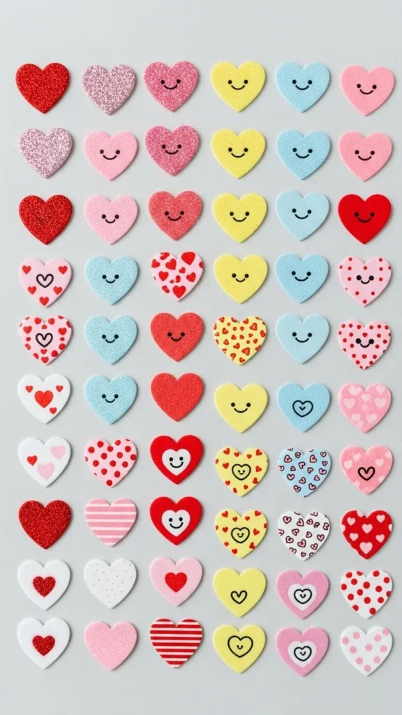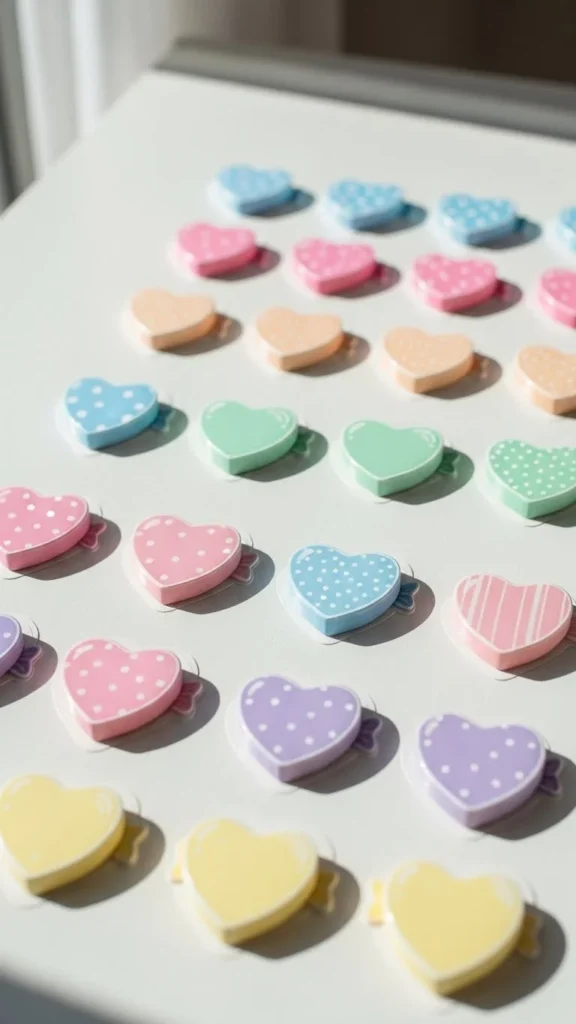 Candy-style hearts feel playful without copying real sweets. Use pastel colors like pink, yellow, and lavender. Keep shapes rounded and simple.