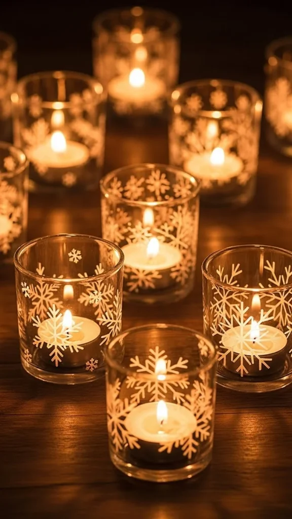 Use small glass votives. Attach paper or adhesive snowflakes around the outside. Place tea lights inside. The snowflake patterns cast delicate shadows when lit. This creates a cozy, wintery ambiance. You can DIY snowflakes from scrap paper or purchase stickers. Arrange several together on a tray or along a mantel for a soft glow.