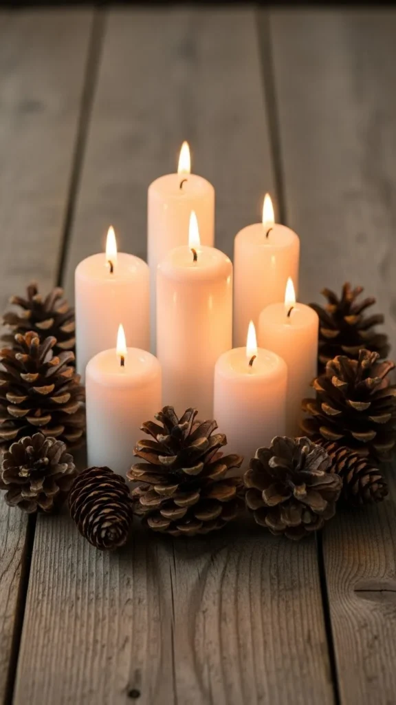 Arrange three candles of varying heights in the center. Surround them with pinecones of different sizes. Add a sprig of greenery for color. Use a shallow tray to hold everything together. This setup is budget-friendly, uses natural elements, and adds warmth. Pinecones can be collected outdoors or purchased cheaply. Keep the candles unscented or lightly scented to avoid overwhelming smells. Layering elements by height creates visual interest without clutter.