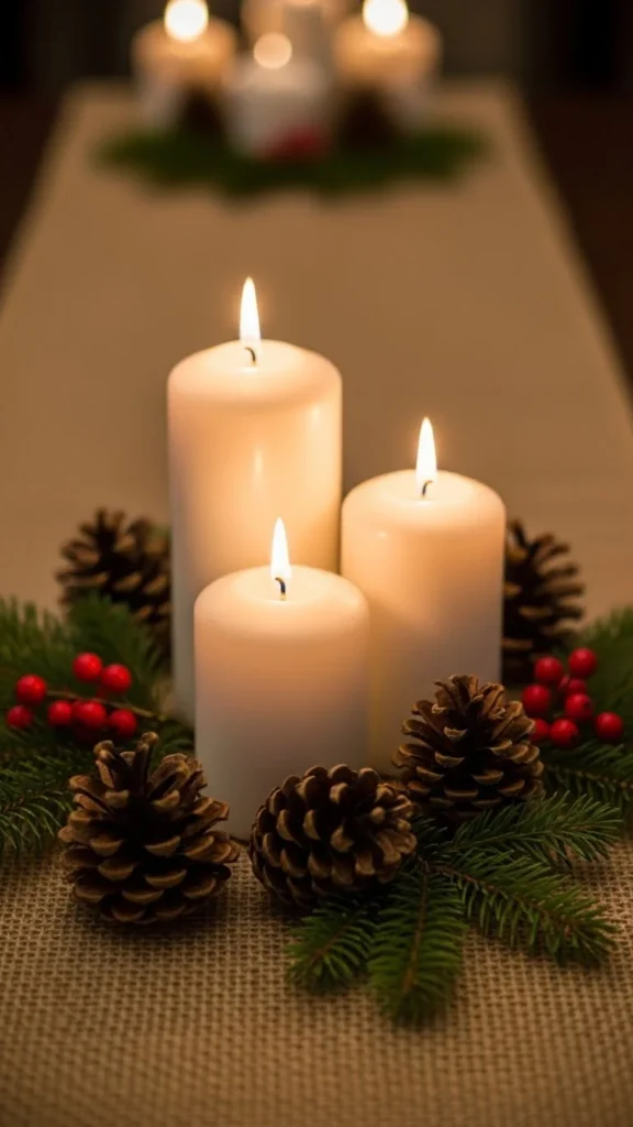 Place a burlap runner on the table. Arrange candles and greenery loosely on top. Add a few pinecones or small wooden accents. The texture of burlap pairs with natural elements for rustic charm. Keep candle heights varied to add dimension. This setup is affordable and easy to remove or adjust. It works for both casual and formal meals.