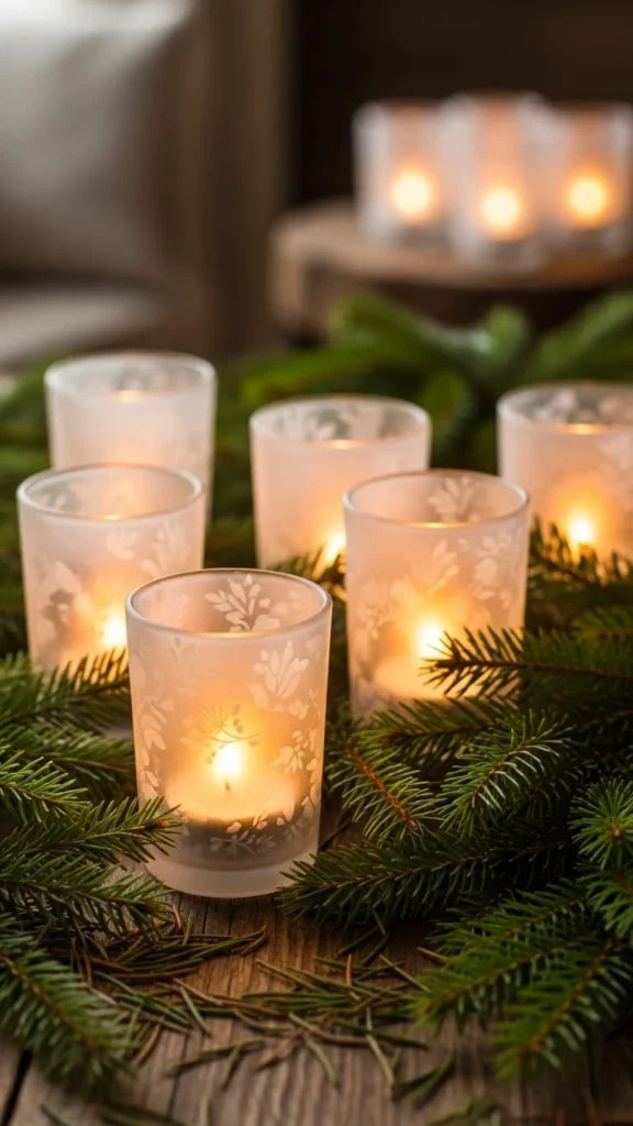 Group frosted votives together on a small tray. Add greenery or pinecones around them. The frosted glass softens candlelight and adds wintery glow. Use tea lights for safety and ease. Arrange odd numbers of votives for a natural look. Frosted holders can be made by spraying jars with frosted glass spray. This is inexpensive and visually appealing.