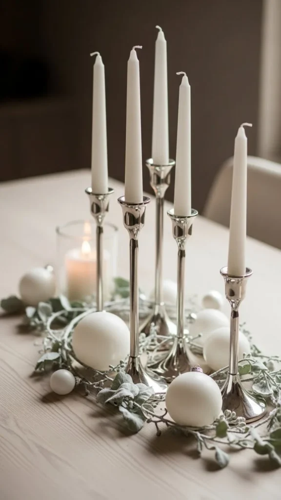 Choose silver and white elements for a clean look. Use small candle holders, white ornaments, and a bit of greenery. Keep spacing even and shapes simple. Minimalist centerpieces feel elegant and can be done quickly with few items. Use items from dollar stores or repurpose holiday décor. Add a small tray to keep everything together if needed.
