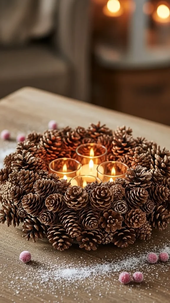 Form a wreath from pinecones and place it flat on the table. Add a few tea lights in the middle. This creates a low centerpiece that doesn’t block sightlines. The circular shape brings visual balance. Pinecones are cheap or free, and wreath bases can be cardboard or wire. Add greenery or ribbon for extra texture. This centerpiece can be reused year after year.