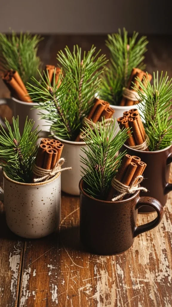 Place mugs of similar size in a cluster. Fill with pine sprigs, cinnamon sticks, or small berries. The mugs act as small vases and bring warmth. Use mugs you already own to save money. The arrangement feels casual and inviting. You can add mini ornaments tucked inside the mugs for extra charm.