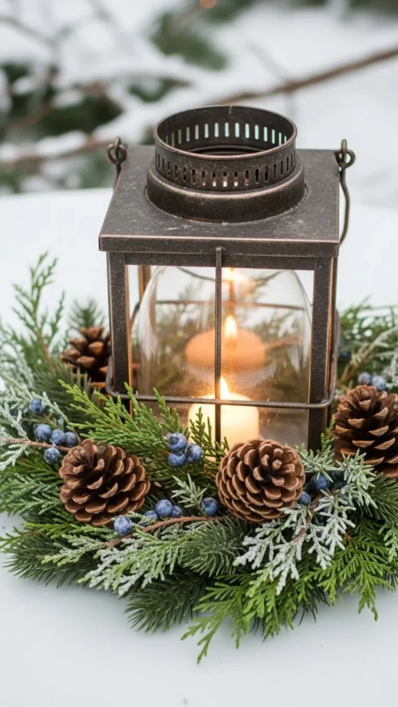 Combine a lantern with a garland wrapped loosely around the base. Add pinecones or small ornaments within the garland. The lantern provides height, while the garland fills the space. This centerpiece feels layered and cozy. You can switch candles for LED lights for safety. Affordable elements make this setup reusable for multiple occasions.