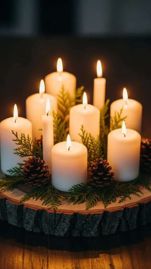 Use a round wooden slice as a base. Add candles of different heights and scatter pinecones or greenery around them. The wood adds texture and natural warmth. Use battery candles for safety or real candles for ambiance. This setup works well for casual or formal dinners. It’s simple, inexpensive, and easy to move.