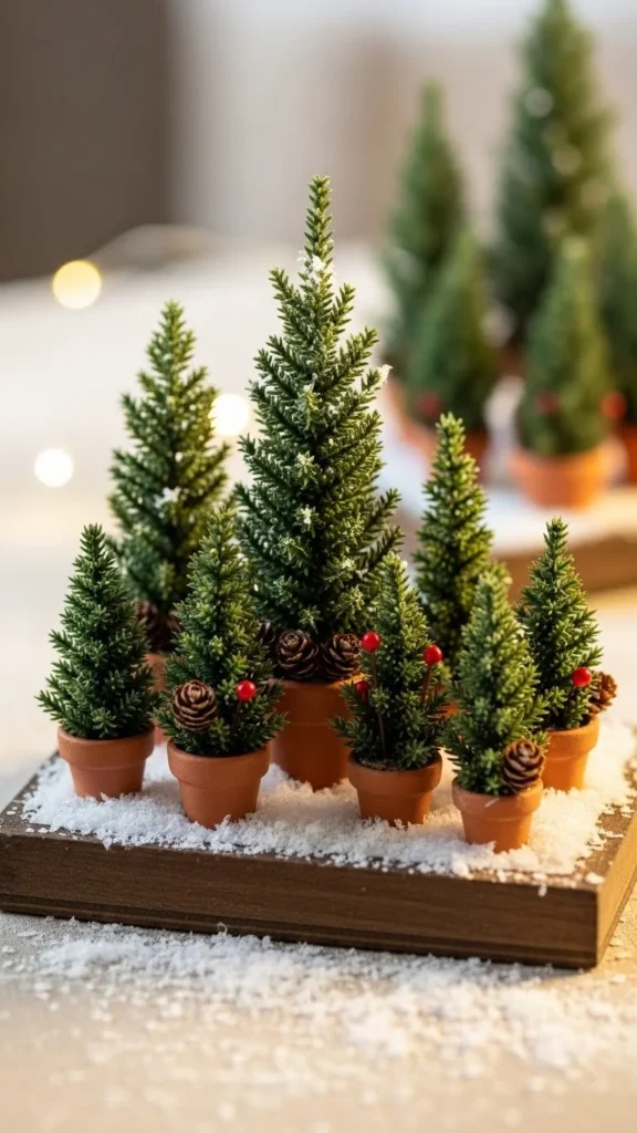 Arrange tiny potted evergreens together on a tray. Add fake snow or white pebbles for a forest effect. Keep some trees taller and others shorter to create depth. This centerpiece is playful and works well for informal tables. Plants can be reused after the season. Layering creates a full look without needing extra materials.