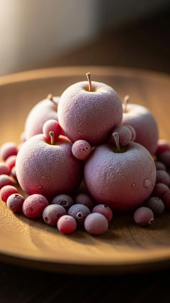 Spray a few fruits lightly with frosted effect spray or glitter. Place on a wooden or ceramic tray. Add pine sprigs around them. This creates color and texture in a subtle, wintery way. Fruits are inexpensive and can be swapped for fresh ones throughout the season. It’s simple, elegant, and food-friendly.