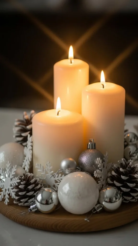 Stack candles at varying heights. Place ornaments around the base and in between candles. This arrangement creates vertical interest. Choose metallic ornaments for sparkle. Keep spacing tight so the cluster feels intentional. Small, repeated elements make the centerpiece feel cohesive. It’s a festive look that doesn’t overwhelm the table.
