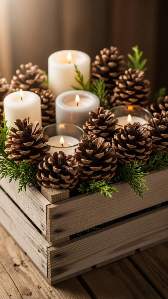 Use a low wooden crate as a base. Fill with natural elements like pinecones, votives, and greenery. The crate frames the arrangement and gives it a rustic feel. Low height ensures visibility across the table. Add a small candle or fairy lights inside the crate for glow. Everything can be reused for other winter décor.