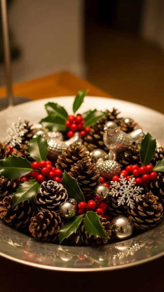 Fill a silver bowl with pinecones, faux berries, and small ornaments. The metallic surface reflects light and adds subtle shine. Place a candle in the center or leave open. Silver adds elegance without cluttering the arrangement. The bowl is reusable for other occasions, making this setup cost-efficient.